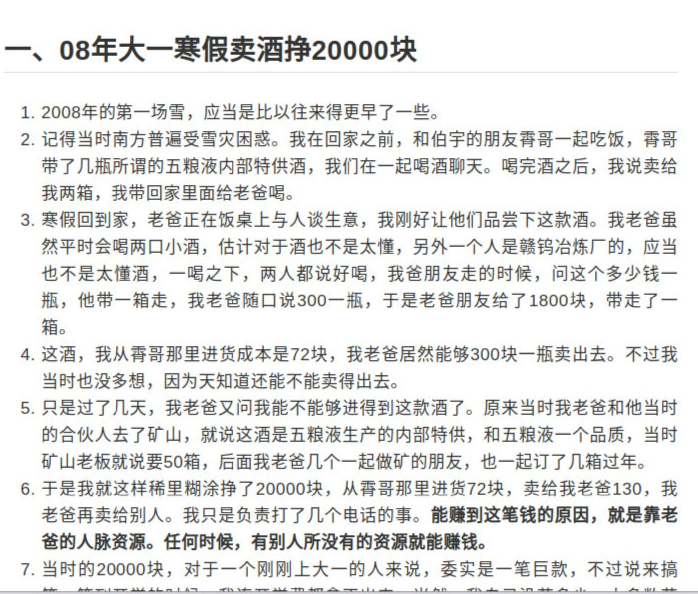 我的大学同学,玩得比较好的,应当都知道我08年寒假,就靠卖酒给我老爸,我就挣了近20000元。